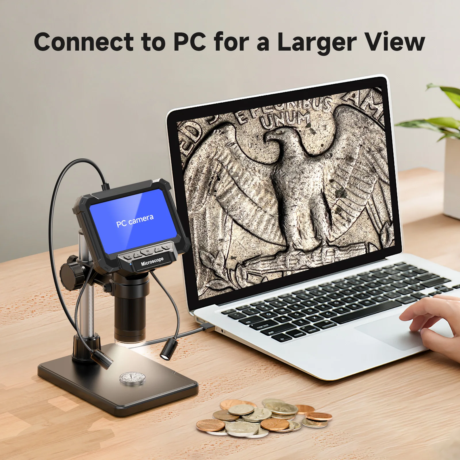 This digital microscope features a 4.3-inch IPS display, providing clear and vibrant visuals for real-time observation without the need for an external monitor. With support for up to 1920P HD video and high magnification up to 1600X, it is well-suited for detailed inspection tasks across various applications.