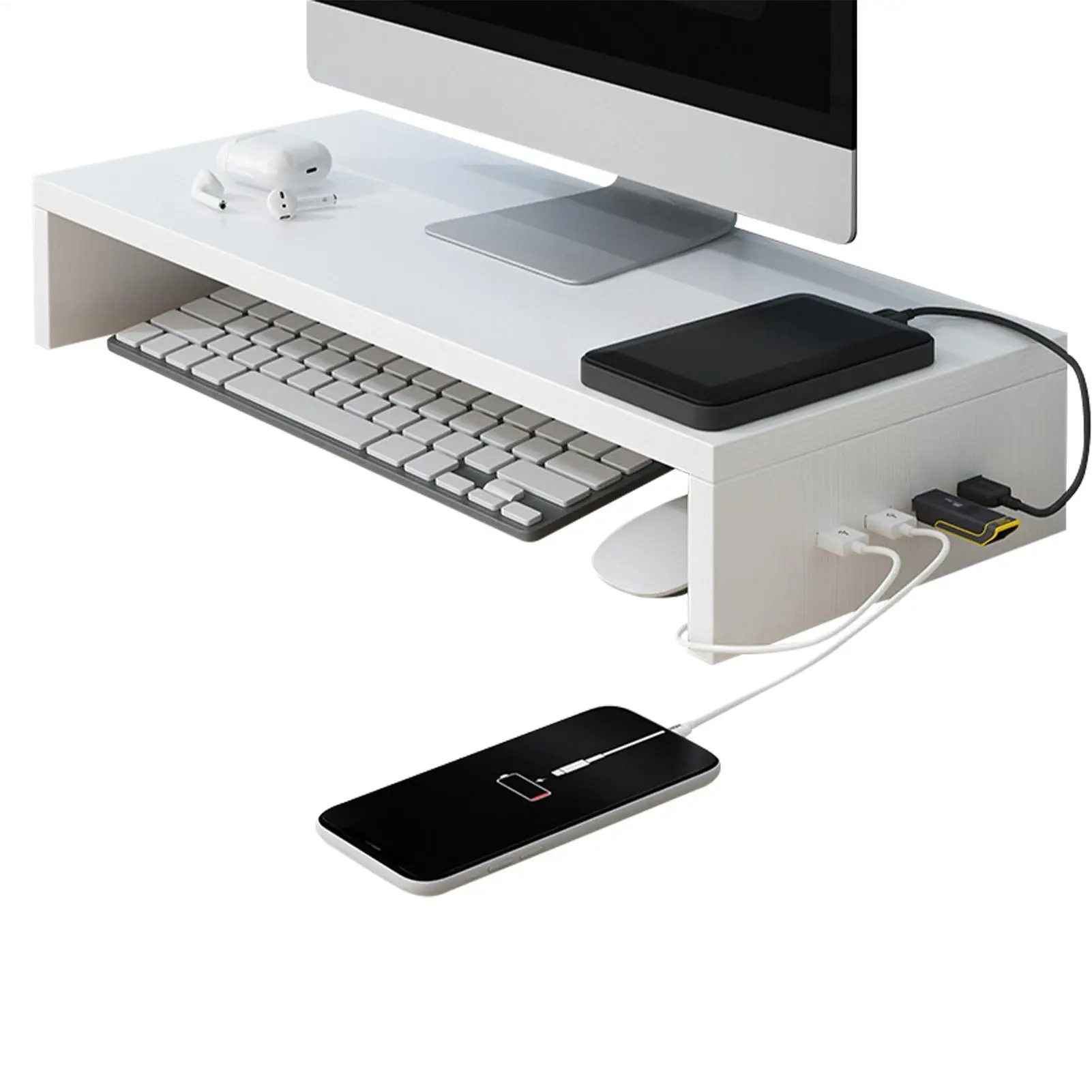 Equipped with 4 built-in USB ports, the stand functions as a convenient hub for connecting devices such as keyboards, mice, flash drives, and other accessories, helping to keep your desk organized and clutter-free.